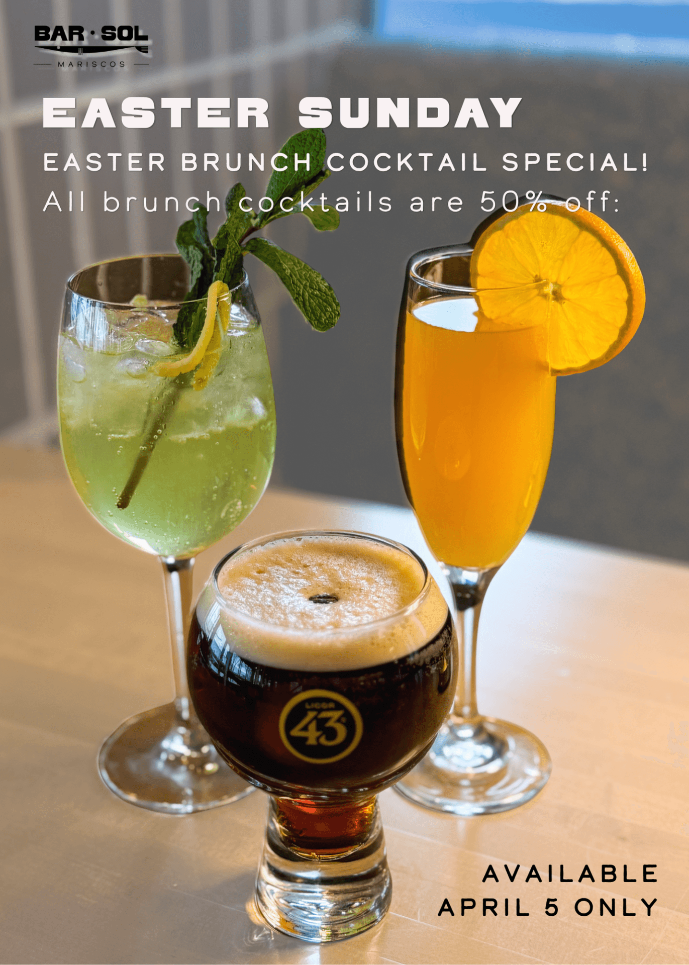 Celebrate Easter with stunning lakefront views and half-off our Brunch Cocktails! Includes Carajillo, Aperol Spritz, Peach Belini, and Limoncello Spritz as well as our Classic Mimosa until 3pm!